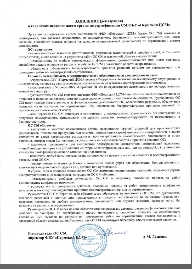 Орган по сертификации систем менеджмента является структурным подразделением Федеральное бюджетное учреждение «Государственный региональный центр стандартизации, метрологии и испытаний в Пермском крае» (ФБУ «Пермский ЦСМ»)